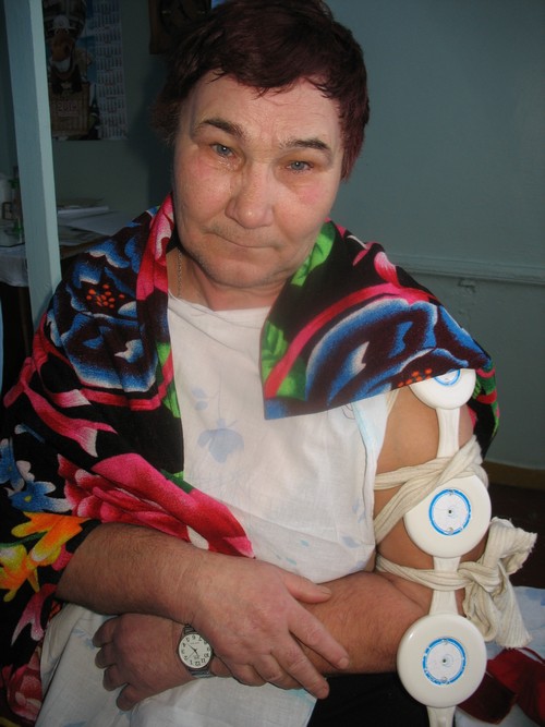В кабинет заходит пожилая женщина - Вере Александровне Гавриловой лечат больную руку. Помогая закрепить на больном месте аппарат "Алмаг", Людмила Петровна комментирует: