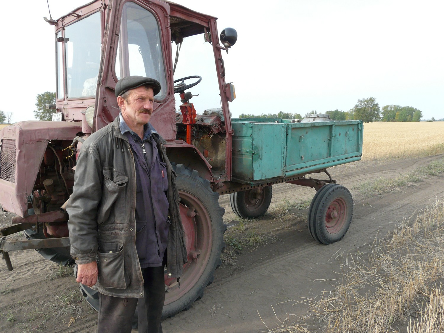 На краю поля - колесный тракторец с кузовком, наполненным запчастями и всяким инструментом. Рядом стоит, как верный страж, и наблюдает за передвигающимися комбайнами помощник бригадира Сергей Алексеевич Печарица - лицо припорошено пылью. Он с 86-го года трудится в полеводстве, в качестве помощника бригадира - с 97-го. В случае поломки он