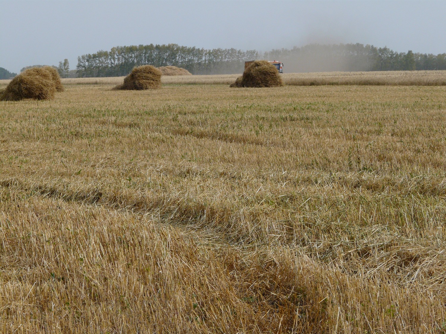 Мы побывали на полях колхоза. Подъезжаем к полю у бывшей деревни Бреусовки. Несколько комбайнов плывут вдали, а седельный "КамАЗ" - зерно на кузове укрыто светлым пологом - уже поехал на Ганновку. Кипит уборка! На утро 12 сентября было убрано 90% площадей, намолочено 7,5 тысячи зерна, на корню оставалось чуть более 400 га пшеницы и ячменя.