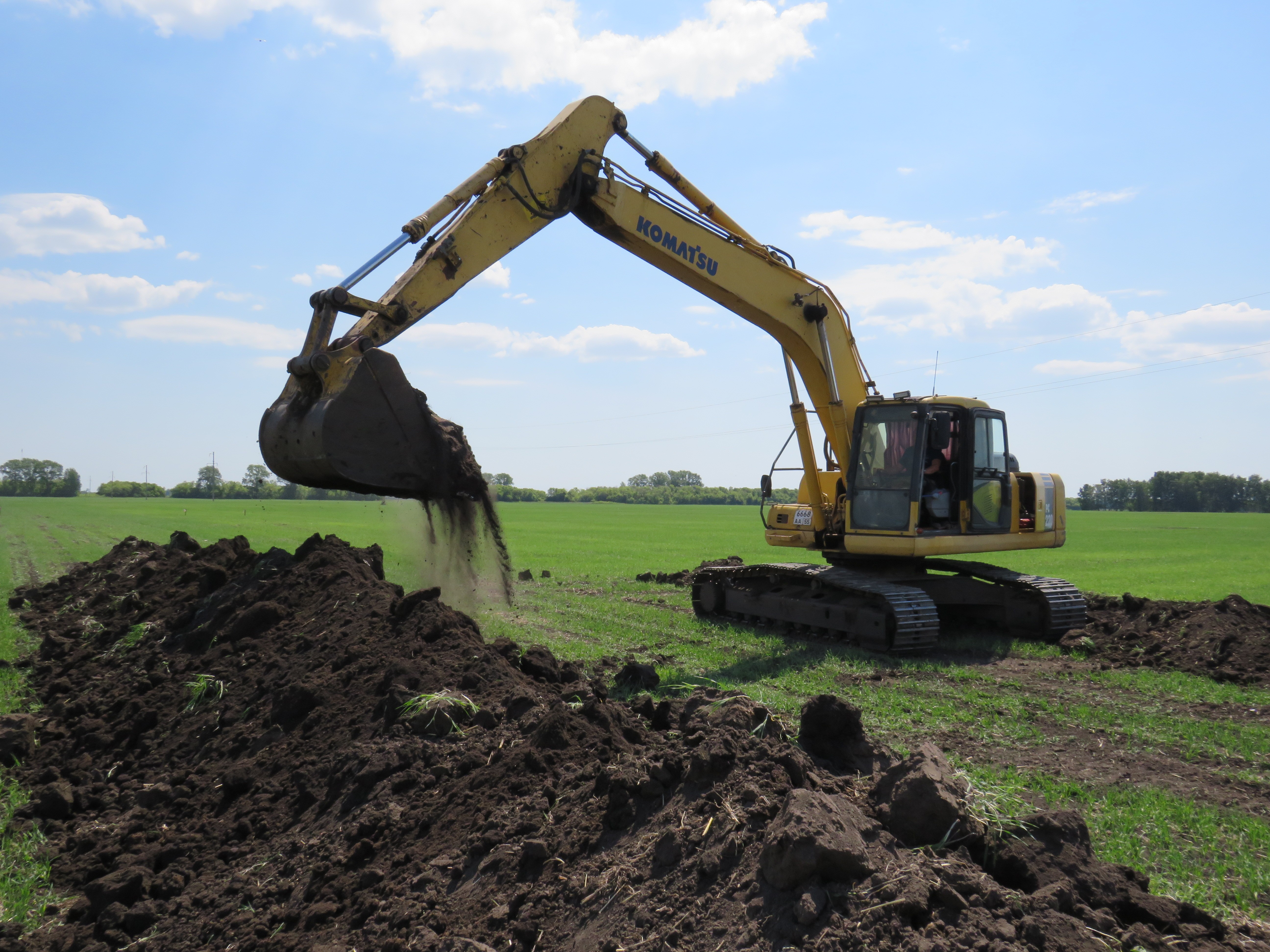 Ширина полосы, которую делает Константин, – около 15 метров, грунт экскаваторщик вынимает на глубину от 30 до 60 см, в зависимости от того, где начинается слой глины. Потом здесь выроют траншею и укладут газовую трубу.