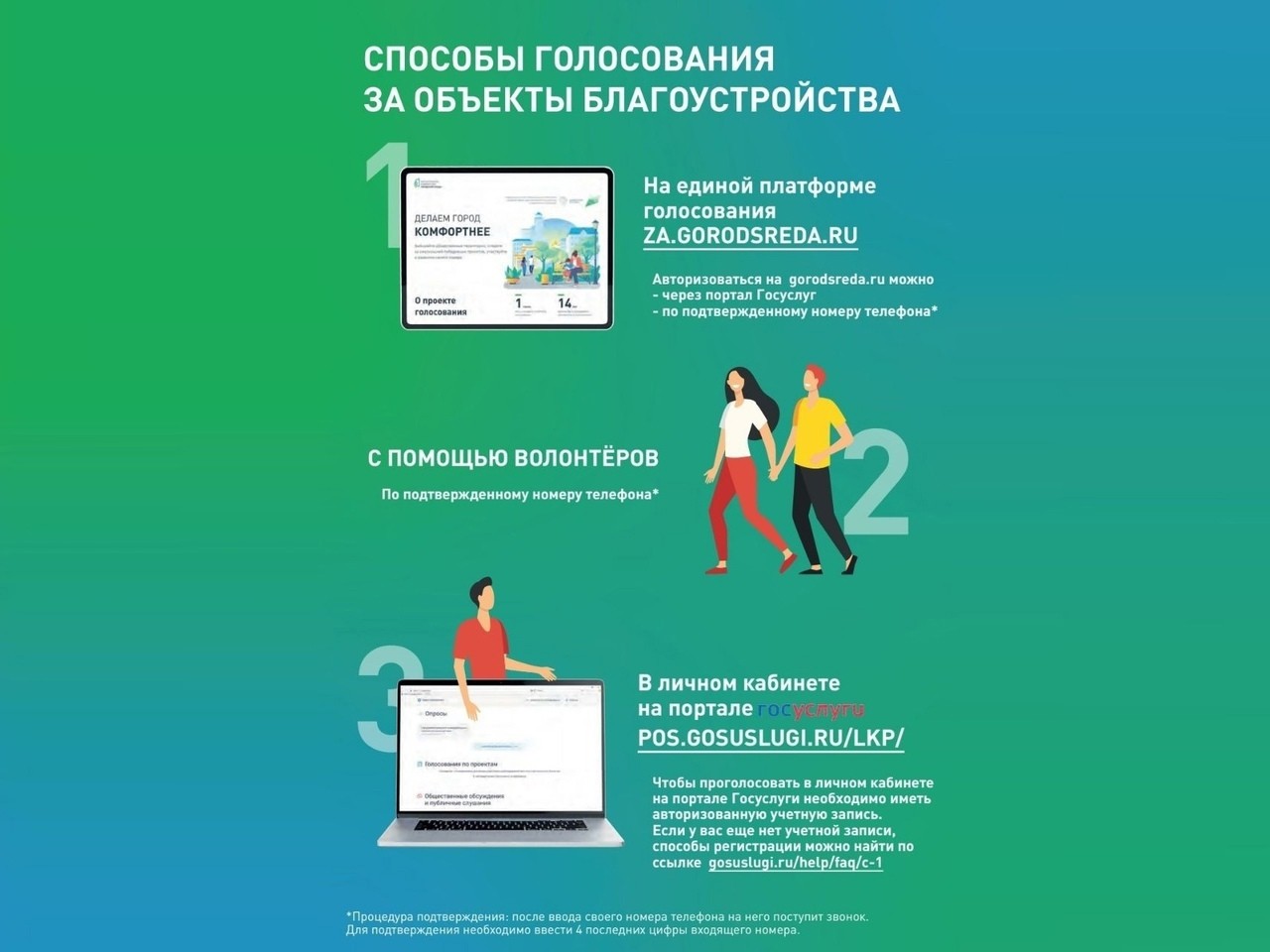 Голосование проходит до 30 мая включительно. Принять участие в нём может любой житель региона старше 14 лет. Отдать голос можно как на платформе 55.gorodsreda.ru (по номеру телефона или с подтвержденной учетной записью «Госуслуг») или же в личном кабинете на портале «Госуслуги», для которого разработан модуль взаимодействия с платформой?. В этом случае учетная запись тоже должна быть подтвержденной. При необходимости можно обратиться к волонтерам, которые помогут проголосовать — для этого им нужно назвать действующий номер телефона. Волонтеры работают на информационных точках в Омске, Исилькуле, Калачинске и Таре в общественных местах и рассказывают жителям региона, какие объекты и проекты представлены на голосование.