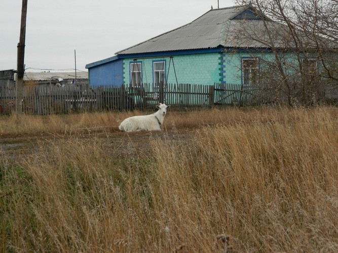Большого белого козла, который равнодушно посмотрел на нашу машину, потряс бородой и даже не сдвинулся с места. Ну, хоть кто-то живой.