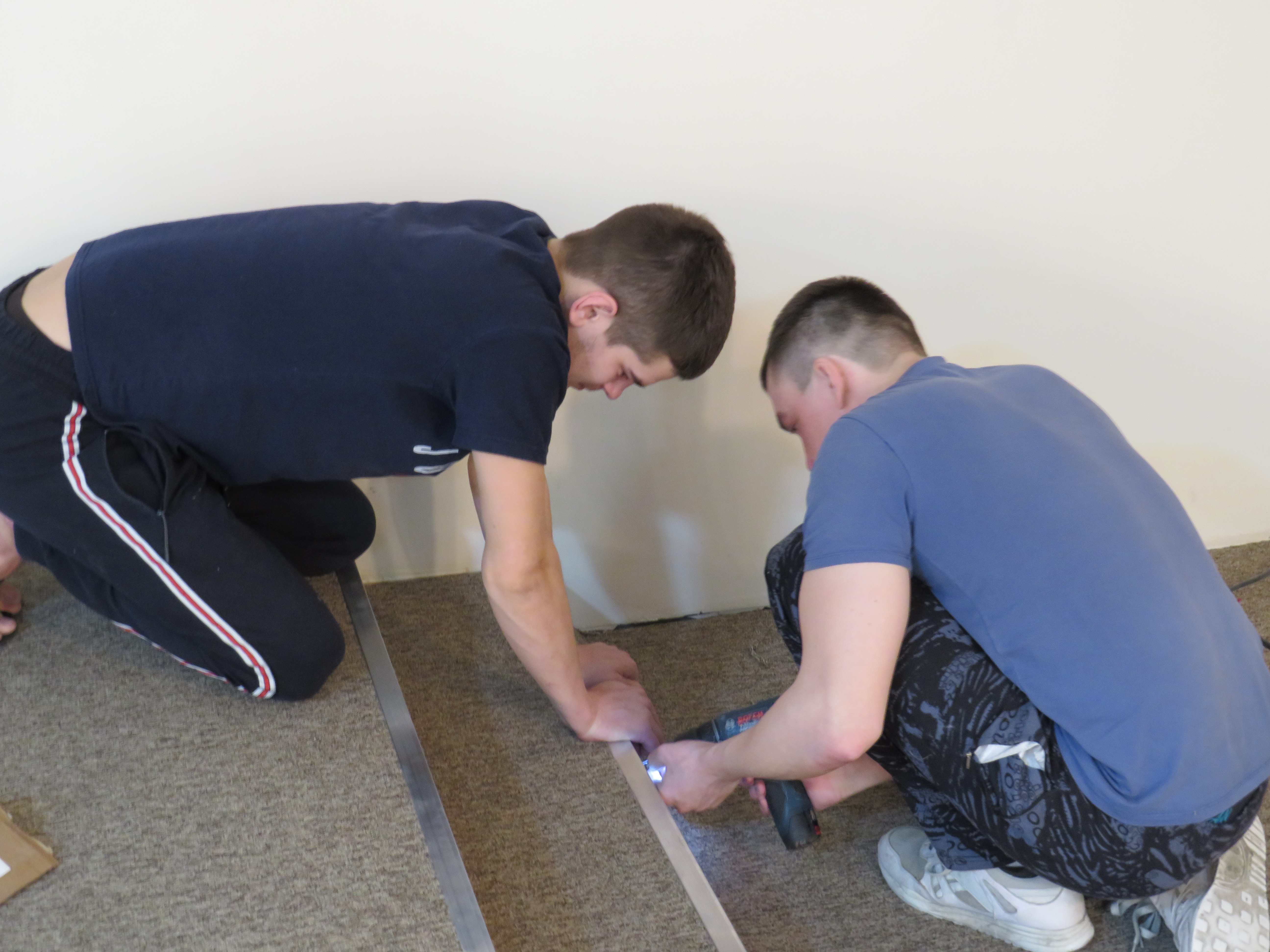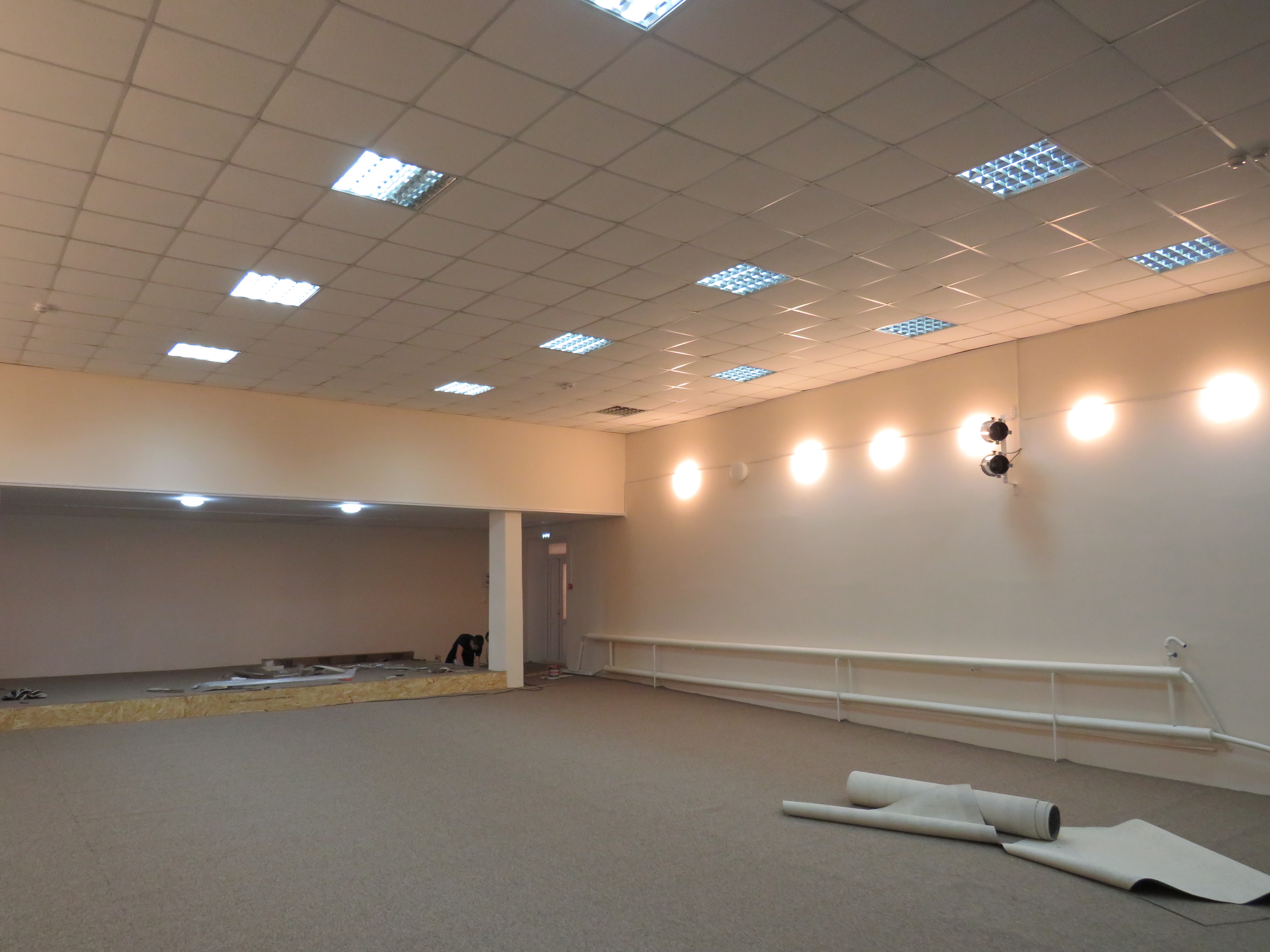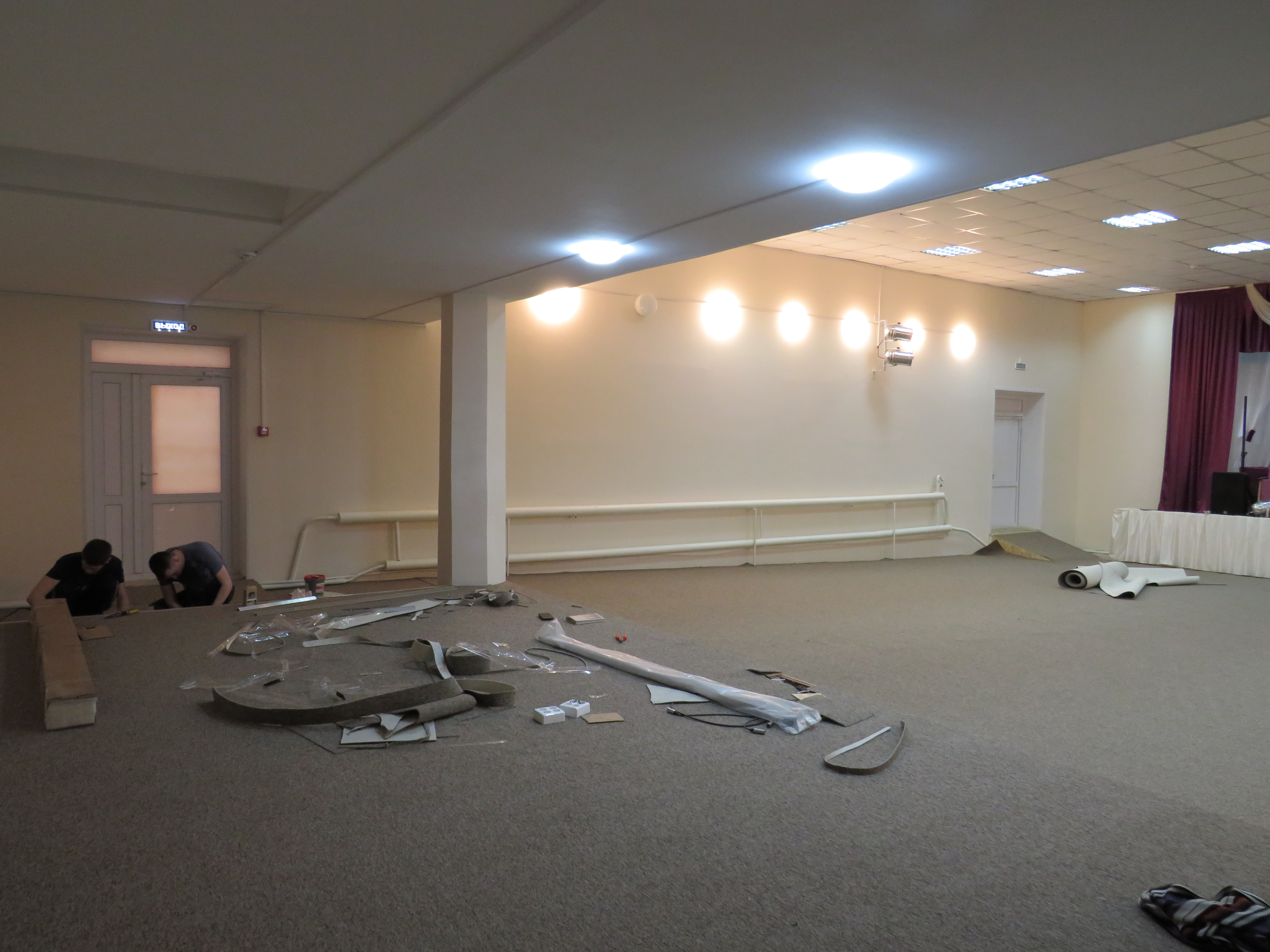- Помощника мы брали, когда снимали деревянную обшивку со стен, а потом уже вдвоём стены обшили гипсокартоном и покрасили в бежевый цвет, - охотно рассказывают Сергей и Руслан. - Убрали деревянное обрамление с колонн и небольшого подиума, который находится в глубине зала напротив сцены. Пол выровняли ОСБ-плитами и сверху покрыли серым ковролином.