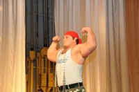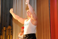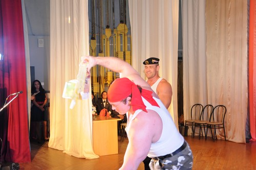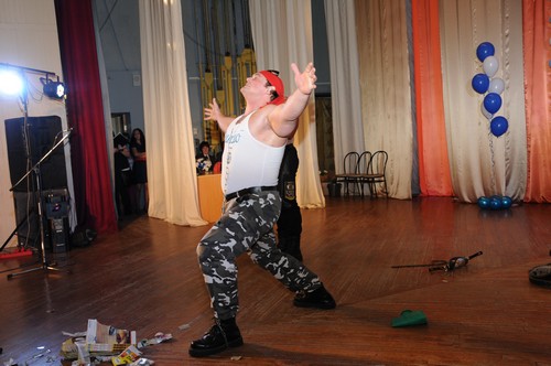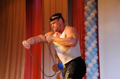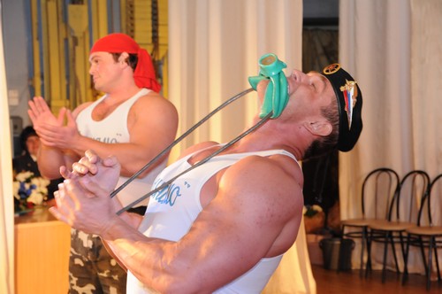 Три парня со своим тренером, играя мышцами, по очереди демонстрировали силу рук и умение владеть телом: рвали руками колоды карт, несколькими вздохами надували и рвали грелку, гнули проволоку руками и зубами.