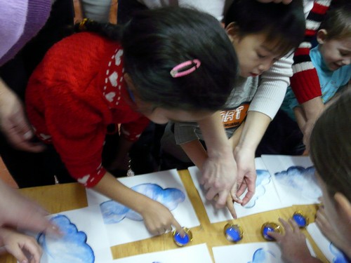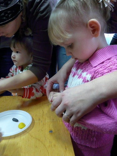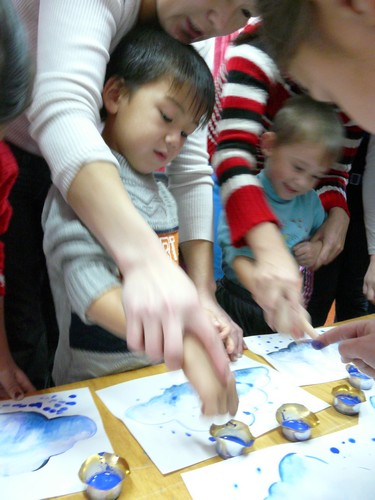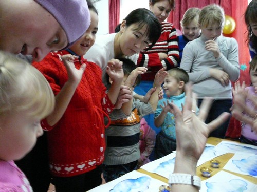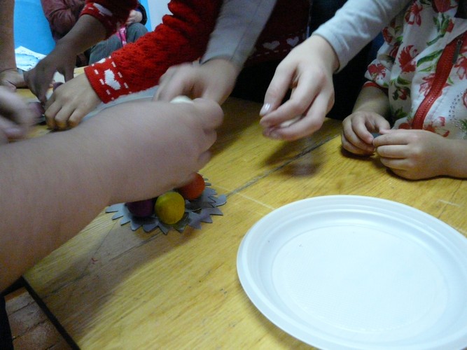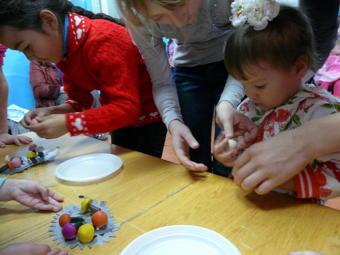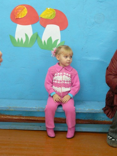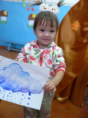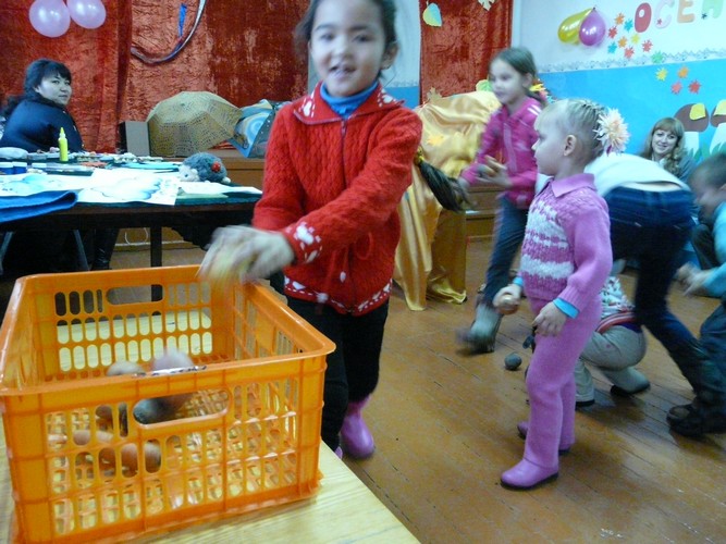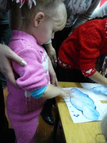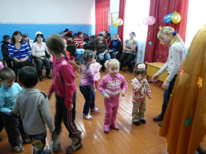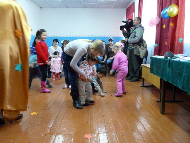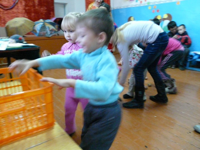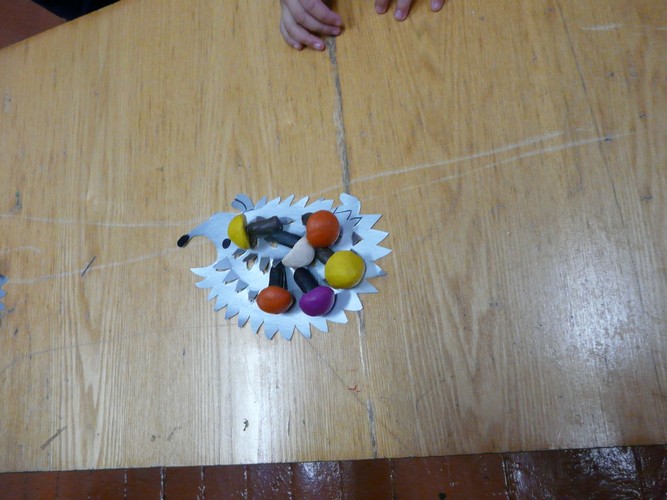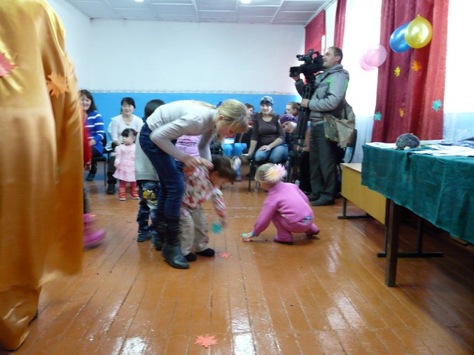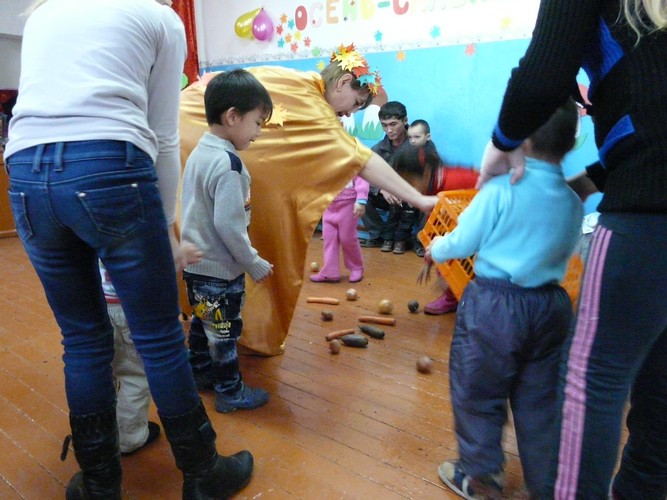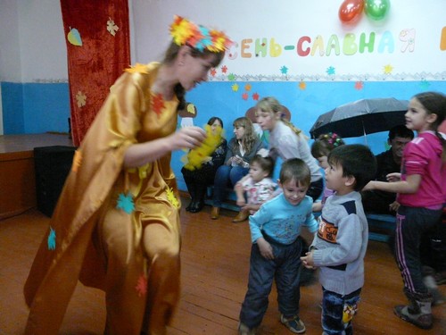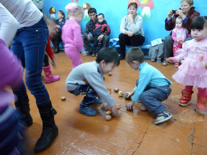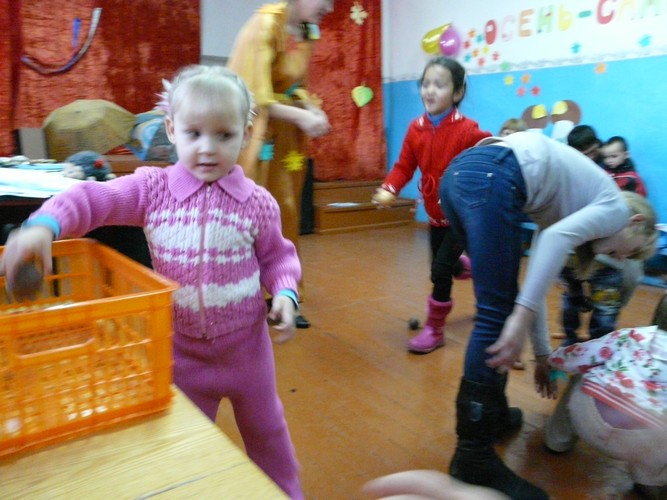 Ребятишки с помощью родителей рисовали на листах капельки дождя, прятались от "дождика" под зонтиками, которые держали мамы. Затем они собирали "грибочки" (части грибов были вылеплены из пластилина заранее) и накалывали их на иголки ежика-игрушки. "Танец с листочками" проходил под листопад с деревьев, которые изображали взрослые. Еще дети учились искусству аппликации - украшали импровизированную салфетку (листок бумаги) листьями с деревьев. Закончился праздник сбором урожая - (по залу заранее были рассыпаны настоящие овощи).