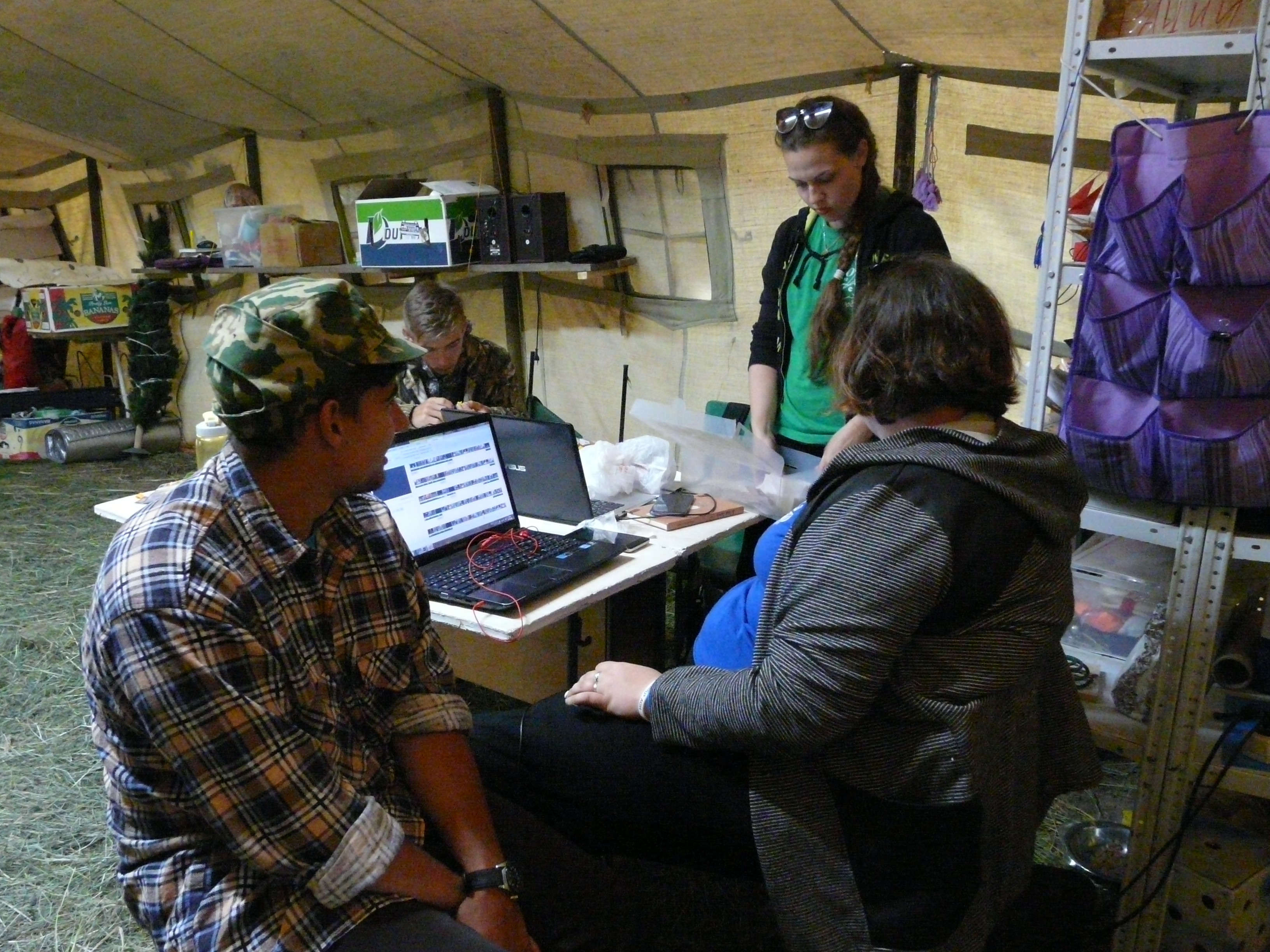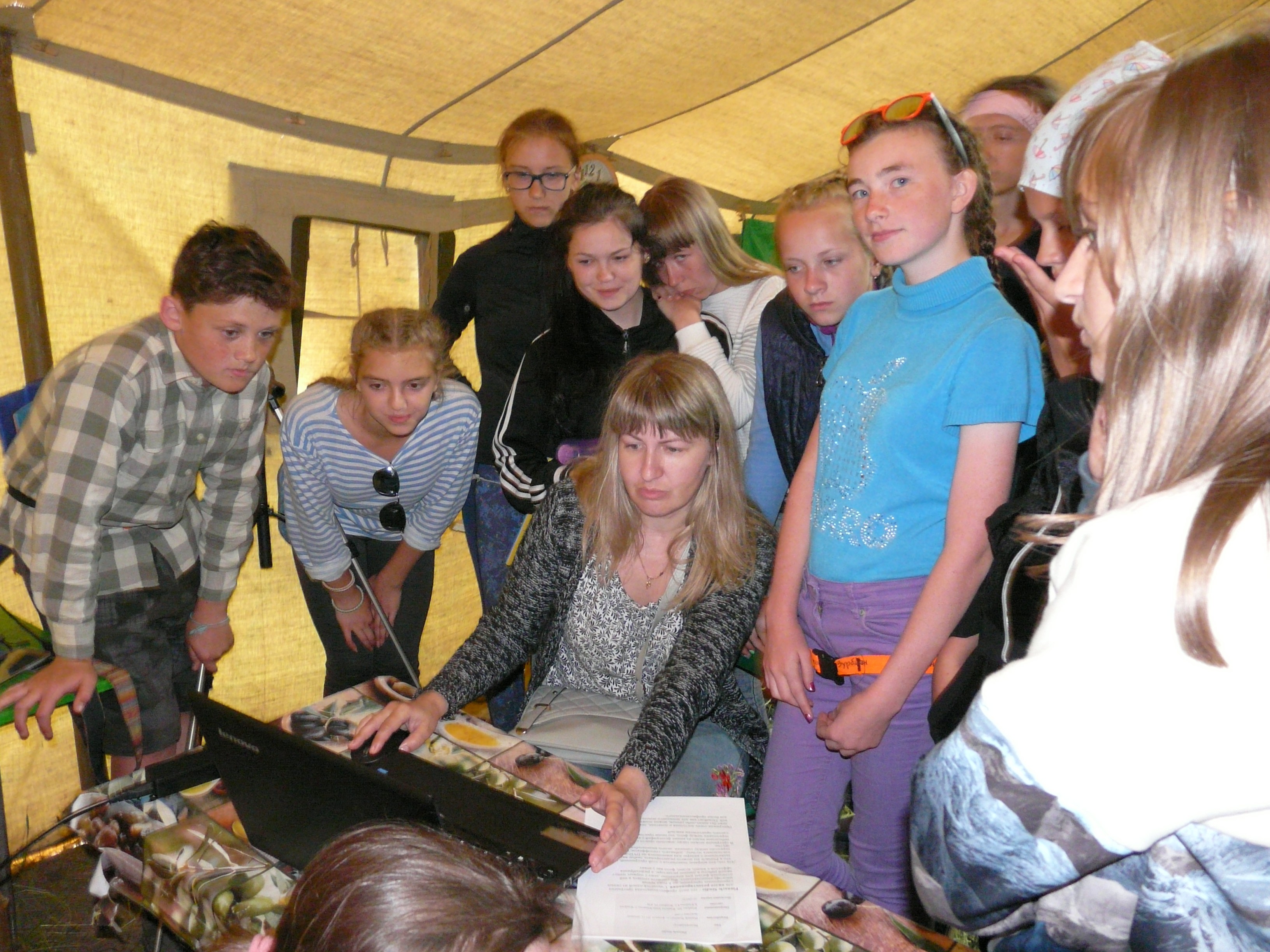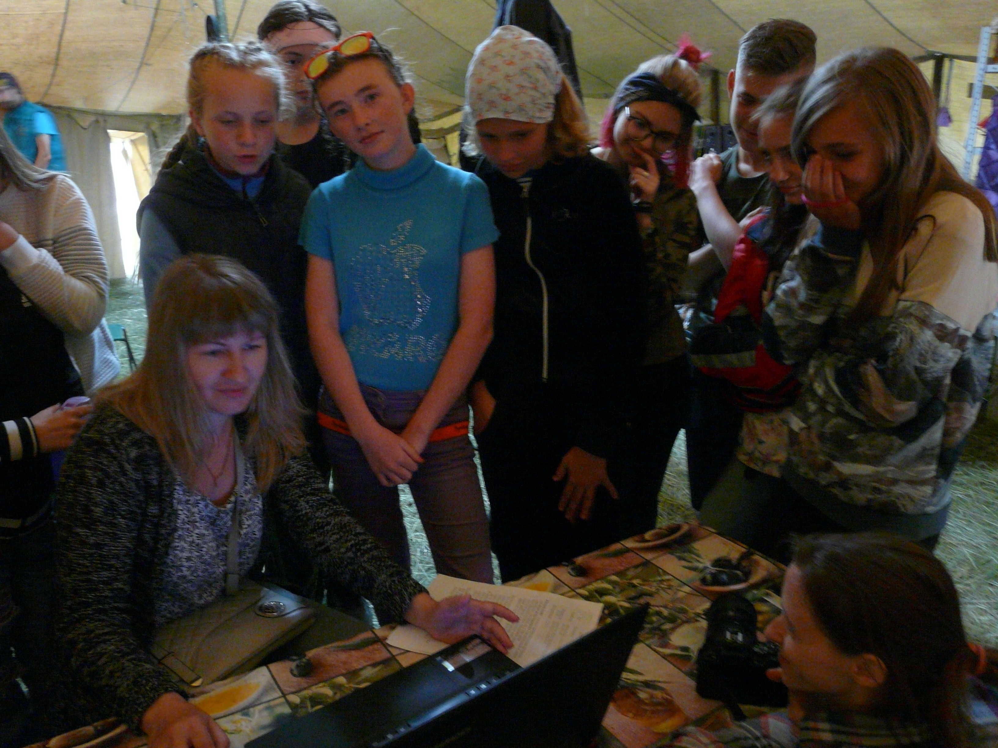 Возле сцены – группа подростков – они учатся фотографировать. А в штабной палатке окружили Татьяну Козинову со всех сторон- это же интересно: как из твоих видео-роликов и фотографий получается фильм!
